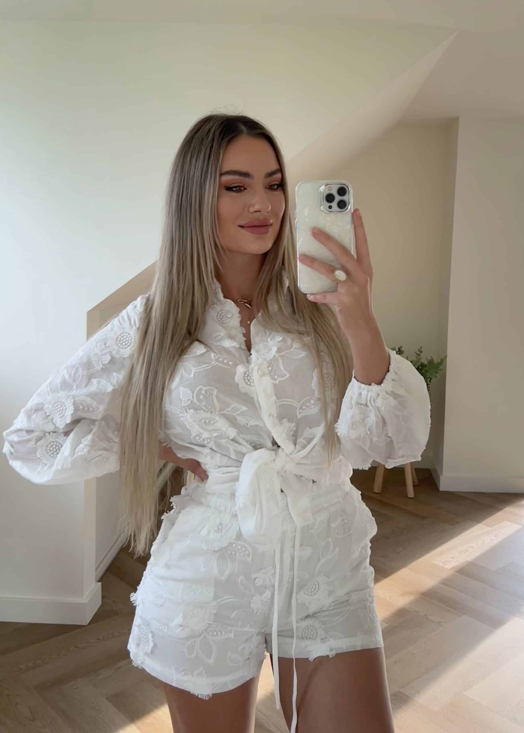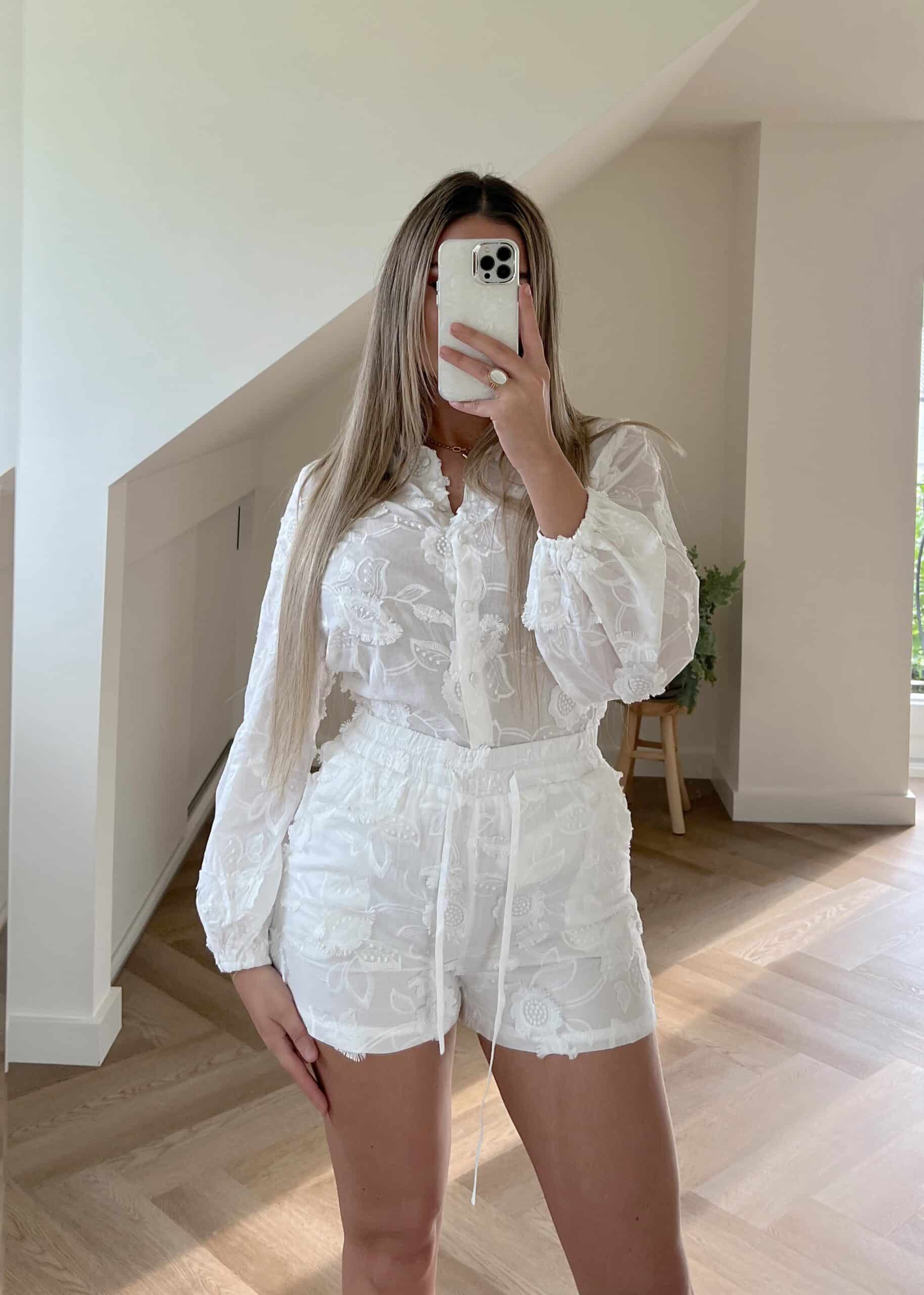 Prachtige kwaliteit witte blouse en short, 2 piece set.